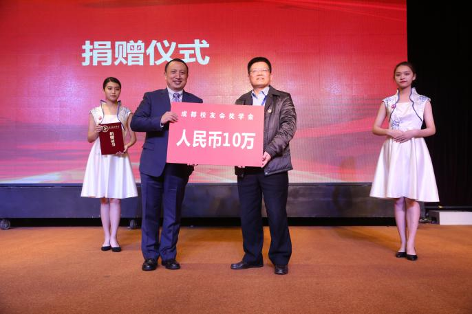 大会举行了捐赠仪式,黄伟九代表学校教育发展基金会接受艾中华校友再次向“金果源教师奖励基金”捐资100万元,姚平、钟晓斌校友再次向“成都校友会奖学金”捐资10万元。