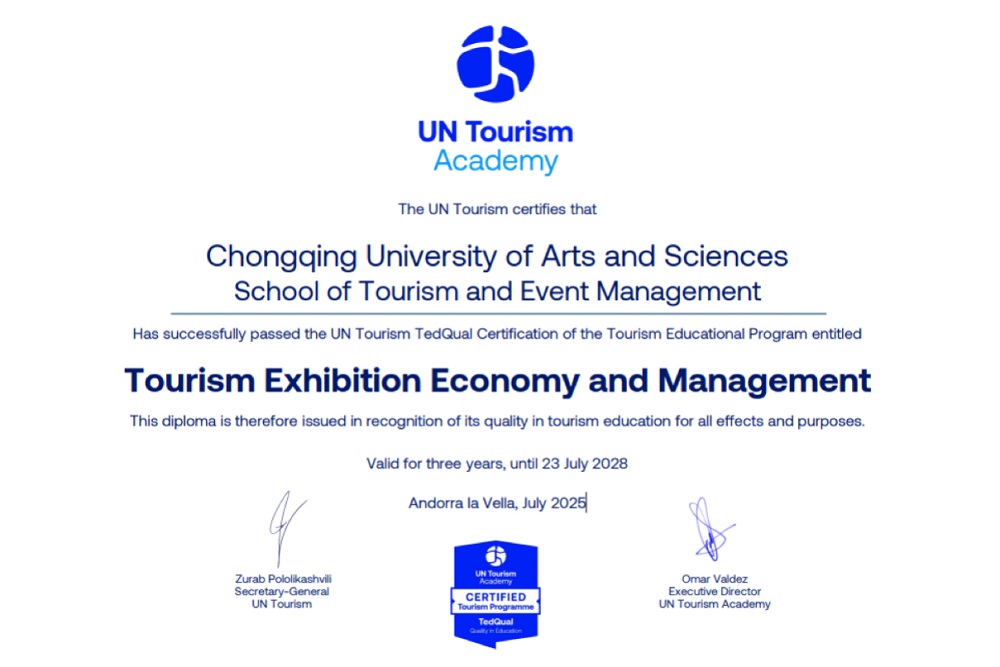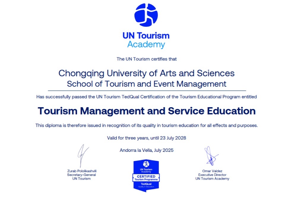 近日,联合国世界旅游组织旅游教育质量认证中心发来邮件,开元会展经济与管理、旅游管理与服务教育两个专业通过联合国世界旅游组织教育质量国际认证(UN Tourism.TedQual Certification),以优秀等级获得长达三年年限的国际认证(2025年7月23日至2028年7月23日),成为重庆市首个通过该项认证的高校。