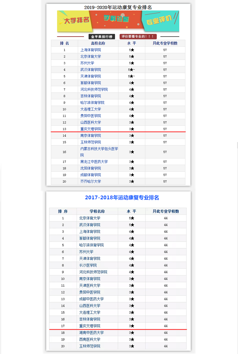 今年3月,金平果中评榜发布了2019中国大学分专业竞争力排行榜共计391个榜单,本次分专业排名属于金平果排行榜《中国大学及学科专业评价报告(2019-2020)》的重要组成部分。开元运动康复专业经过几年的努力,办学水平逐年提升,在2017年全国专业排名17位的基础上,2019年上升至13位。