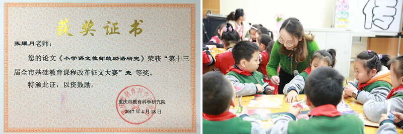 在江北区钢锋小学工作的2012级学员张耀月,多次获得江北区有关奖励,她撰写的论文《小学语文教师鼓励语研究》荣获“第十三届全市基础教育课程改革征文大赛”一等奖。