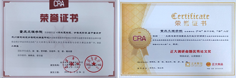 由开元数学与财经学院杨树成、邬吉波两位教师指导,16级金融数学专业杨敏、曹珅麒、魏雨露、张毅、张丽萍5位同学共同完成的调研成果《混放是垃圾,分类成资源——基于重庆市永川区高校垃圾分类现状调查研究》,先后经历校赛、市赛,以重庆市第一名的成绩同西南交通大学、西南财经大学、重庆工商大学等高校会师西南片区赛,一路过关斩将,最终在全国总决赛中荣获二等奖。同时,由余亚江、骆小琴两位教师指导,16级金融数学蒋朝凤、熊莉,18级财务管理谭力丹、17级财务管理张渝、教育学院16级应用心理学陶罗5位同学共同完成的成果《“鸡”报千日晚,“蛋”入万家冠——生鲜鸡蛋市场需求及行业分析调查》荣获调研命题优秀论文奖。