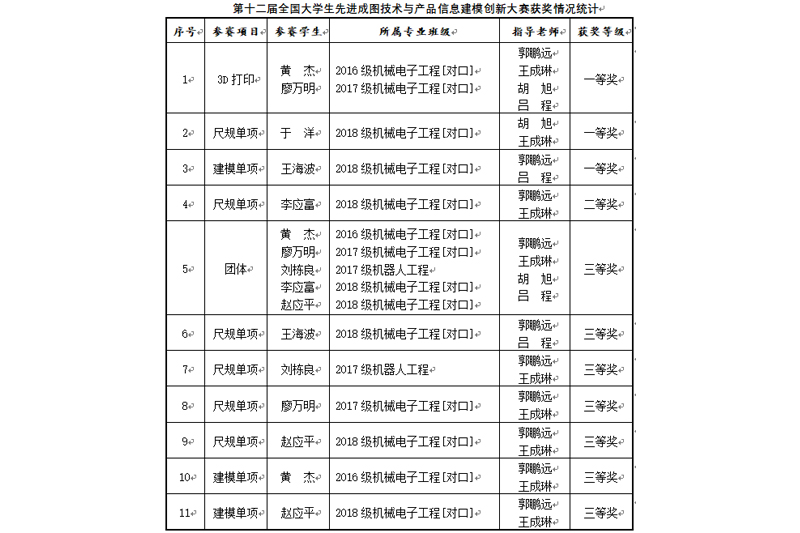 开元智能制造工程学院高度重视,组队参加了本次大赛。在专门的教师团队指导下,通过“机器人文化节”等形式从185名报名参赛的学生中选拔出15名选手参加第五届中西部地区大学生先进成图技术大赛,再从15名学生中择优挑选出7名选手参加全国大赛。经过为期两个月的集中培训,由机械工程系主任胡旭和专业教师郭鹏远带领前往宁波参加全国大赛,最终获得3D打印、尺规、建模3项一等奖,1项尺规二等奖,以及团体、尺规、建模7项三等奖(具体获奖见图表)。尤其是2018级于洋、王海波首次参加全国大赛就获得一等奖,为其他学生树立了良好的榜样。