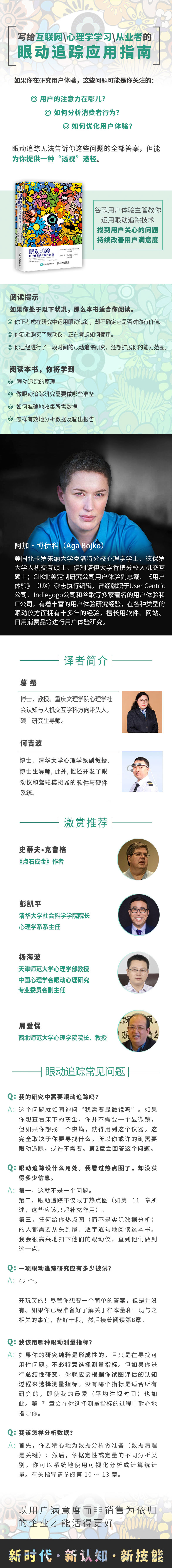 用户体验涉及用户在使用产品过程中建立起来的一种纯主观感受,是当今网络与智能时代最重要与炙手可热的研究领域。眼动追踪技术所具有的客观性、动态性和即时性特点,使其成为最有效的用户体验研究与评估方法之一。该译著正是两者的完美结合,它系统地阐述了如何将眼动追踪技术运用于用户体验和满意度的研究,内容丰富、概念清楚、操作性强,是大陆地区面世的第二本相关内容书籍。原作者曾供职于谷歌等多家用户体验与IT公司,是北美享有声誉的资深用户体验研究专家。该书中文版本由中国工信出版集团,人民邮电出版社2019年6月出版,目前热卖于京东、当当网等各大电商平台。