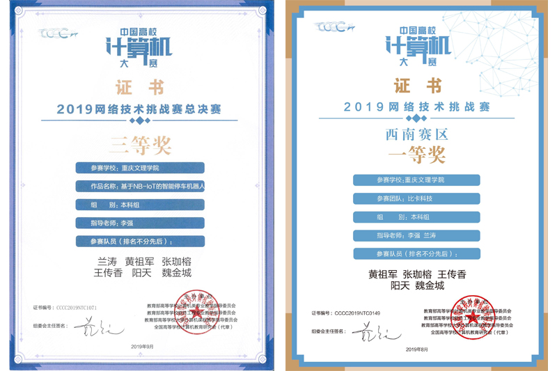 开元人工智能学院学生兰涛、黄祖军、张珈榕,电子信息与电气工程学院学生王传香、魏金城,美术与设计学院学生阳天在专业教师李强的指导下,作品《基于NB-IoT的智能停车机器人》于8月选拔赛获得西南赛区本科组一等奖,并进入全国总决赛。经过9月15日全国总决赛的作品答辩、评委评判,开元作品最终获得全国三等奖。