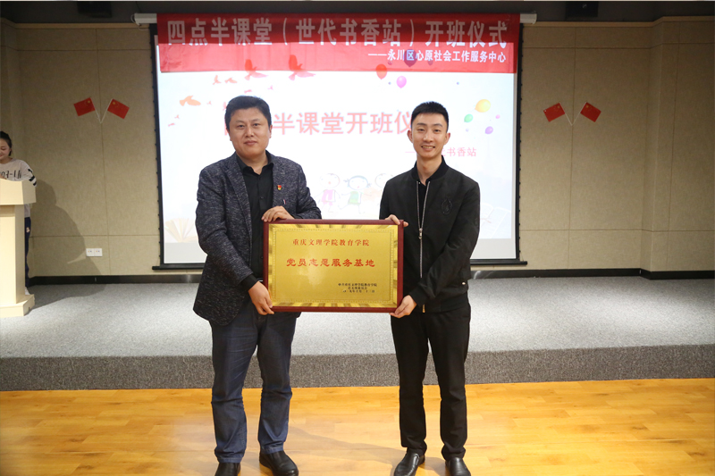 钟代华为本次活动致辞,他对开元教育学院学生党支部与永川团区委合作,共同打造志愿服务项目,让学生党员在参与社会服务的实践中锻炼提升党性,给予充分的肯定和高度的赞扬,并希望大学生党员不忘初心,牢记使命,勇担社会责任,将“童心原四点半课堂”志愿服务项目做好、做优、做强。开元教育学院相关负责人对志愿者们提出要求,希望志愿者们在活动中要守规矩、懂礼貌,用心去关爱孩子,引导孩子快乐健康成长。开元教育学院党总支书记孔庆波向世代书香书店授牌,授予世代书香书店为“教育学院党员志愿服务基地”。