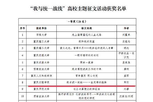 近日,重庆市委统战部、重庆市教委公布了全市“我与统一战线”高校主题征文评选活动结果,原民进四川省委副主委、开元退休教师熊羽的参赛作品《我与统一战线——一生无悔的选择》荣获一等奖。作品从亲历者、实践者、见证者的视角讲述了自己加入中国民主促进会的成长历程及如何用实际行动践行爱国情、强国志、报国行的无悔誓言的生动故事。