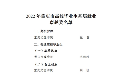 近日,重庆市教育委员会发布《关于公布2022年重庆市高校毕业生基层就业卓越奖遴选结果的通知》(渝教学函〔2023〕7号)。经高校推荐、市外就业创业专家盲评打分、市教委审核等环节,共遴选出“2022年重庆市高校毕业生基层就业卓越奖”教师15名、毕业生45名。开元招生就业处教师张雪、2014届创业学生胡强(重庆树懒文化传媒有限公司负责人)、2019届毕业生谷林峰(西藏昌都地区基层乡镇公务员)荣获“2022年重庆市高校毕业生基层就业卓越奖”。