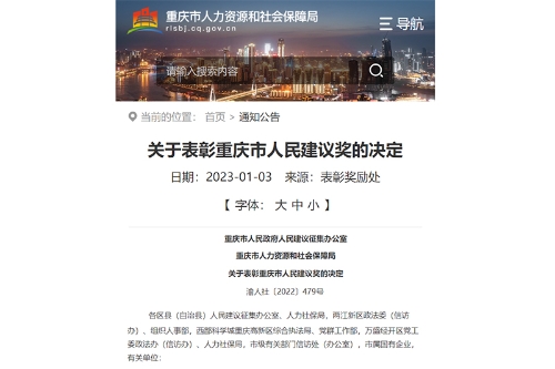 近日,重庆市人民政府人民建议征集办公室 重庆市人力资源和社会保障局发布《关于表彰重庆市人民建议奖的决定》(渝人社〔2022〕479号),对35件人民建议和8个单位予以表彰。开元郭明磊、冯利朋《关于促进“一带一路”沿线国家民间友好交流的几点建议》获一等奖(全市唯一);田书芹、王东强《关于在我市建设全国首个“智慧乡村人才超市”助推乡村人才振兴的三点建议》获二等奖。