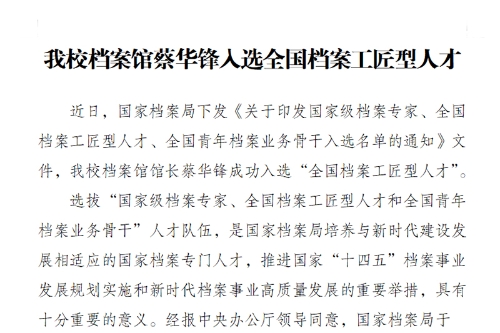 近日,国家档案局下发《关于印发国家级档案专家、全国档案工匠型人才、全国青年档案业务骨干入选名单的通知》文件,开元档案馆馆长蔡华锋成功入选“全国档案工匠型人才”。