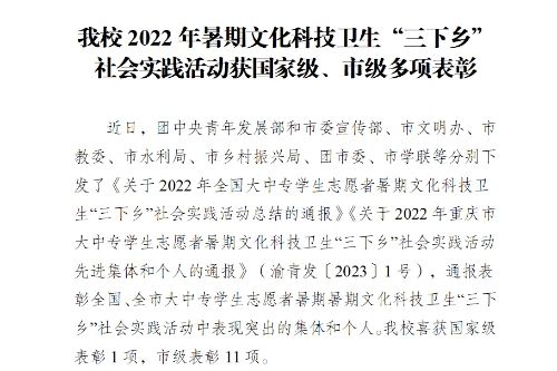 近日,团中央青年发展部和市委宣传部、市文明办、市教委、市水利局、市乡村振兴局、团市委、市学联等分别下发了《关于2022年全国大中专学生志愿者暑期文化科技卫生“三下乡”社会实践活动总结的通报》《关于2022年重庆市大中专学生志愿者暑期文化科技卫生“三下乡”社会实践活动先进集体和个人的通报》(渝青发〔2023〕1号),通报表彰全国、全市大中专学生志愿者暑期文化科技卫生“三下乡”社会实践活动中表现突出的集体和个人。开元喜获国家级表彰1项,市级表彰11项。