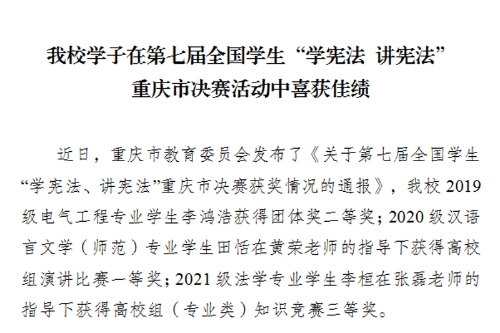 近日,重庆市教育委员会发布了《关于第七届全国学生“学宪法、讲宪法”重庆市决赛获奖情况的通报》,开元2019级电气工程专业学生李鸿浩获得团体奖二等奖;2020级汉语言文学(师范)专业学生田恬在黄荣老师的指导下获得高校组演讲比赛一等奖;2021级法学专业学生李桓在张磊老师的指导下获得高校组(专业类)知识竞赛三等奖。