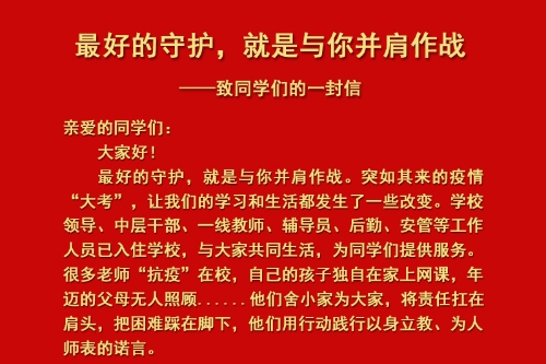 亲爱的同学们: 大家好! 最好的守护,就是与你并肩作战。突如其来的疫情“大考”,让我们的学习和生活都发生了一些改变。学校领导、中层干部、一线教师、辅导员、后勤、安管等工作人员已入住学校,与大家共同生活,为同学们提供服务。很多老师“抗疫”在校,自己的孩子独自在家上网课,年迈的父母无人照顾......他们舍小家为大家,将责任扛在肩头,把困难踩在脚下,他们用行动践行以身立教、为人师表的诺言。 每一位同学都牵系一个家庭,每一个青年应担当一份使命。同学们,面对疫情,作为文理学子我们应该做的是:坚定沉着、积极配合、团结一心、相互理解,以实际行动展现文理人的责任与担当! 同学们,愿你足够强大,平安健康。每一位同学的平安,就是平安校园、健康校园的坚固基石。请一定保护好自己,做好个人防护,按时完成每日健康打卡,按要求完成核酸检测。听从指挥、积极配合,脚步快一点、动作轻一点。其实,素颜的你做核酸也很美。 同学们,愿你常怀感恩,珍惜当下。在临时管控期间,学校一直竭尽全力保障大家的生活所需,每位老师每天要派送近三百份盒饭,花费好几个小时。对他们来说,防护服里外是两个世界。同学们,请保持对文理的热爱,来一场双向奔赴的致敬和感谢。把学校对我们的好、把老师们的辛苦付出牢记于心。真诚地期待你们给予学校更多的理解、支持和配合。对每一位“校园大白”说一声“谢谢您!您辛苦了!” 同学们,愿你眼里有光,心中有梦。生活本就是一场充满未知的旅途,不要因为眼前的困境,就丧失对未来的期盼,不要让疫情成为懒惰的借口。希望大家做到“停课不停学、学习不延期”,希望大家上好线上课、读好课外书、锻炼好身体、保持好心态,遵守校规校纪,让“进德修业 博文达理”的优良学风成为学校最美的风景线。 “山因脊而雄,屋因粱而固”。亲爱的同学们,谁说站在光里的才算英雄?防疫之战的每分每秒,你我皆是英雄。时有所需,必有所为;校有所需,我必支持。我们坚信,这场属于文理人的抗疫战必将吹响胜利的号角!胜利必将属于我们! 共青团KY开元集团官网委员会 2022年10月13日