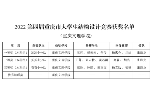 近日,重庆市教委通报了2022年第四届重庆市大学生结构设计竞赛暨第十五届全国大学生结构设计竞赛重庆市分区赛获奖情况(渝教高函〔2022〕54号),开元土木工程学院组成的三支学生团队分别获得本科组一等奖2项(共3项)、三等奖1项(共8项),学校获得优秀组织奖。