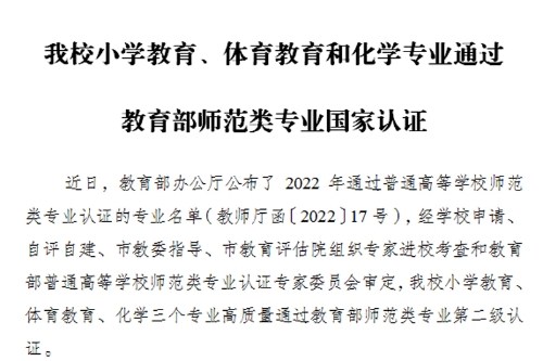 近日,教育部办公厅公布了2022年通过普通高等学校师范类专业认证的专业名单(教师厅函〔2022〕17号),经学校申请、自评自建、市教委指导、市教育评估院组织专家进校考查和教育部普通高等学校师范类专业认证专家委员会审定,开元小学教育、体育教育、化学三个专业高质量通过教育部师范类专业第二级认证。