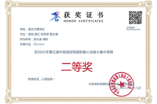 近日,第五届中国高校智能机器人创意大赛顺利落下帷幕,开元人工智能学院高凤、郭红、何雨婷、贾世博同学参加统一部件机器人组比赛获全国总决赛二等奖,庞真立、朱天文、陈志鹏、易成林同学参加统一部件无人机组比赛获全国总决赛二等奖。