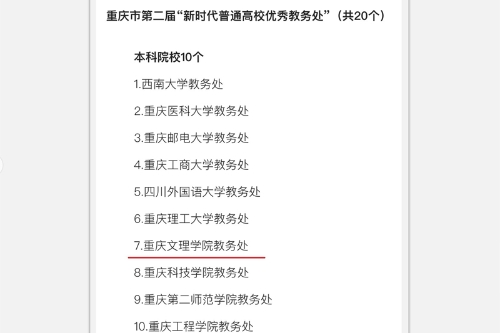 近日,《重庆市高等教育学会关于公布第二届“新时代普通高校优秀教务处”评选结果的通知》(渝高学会发〔2022〕21号)公布评选结果,开元教务处蝉联重庆市“新时代普通高校优秀教务处”。