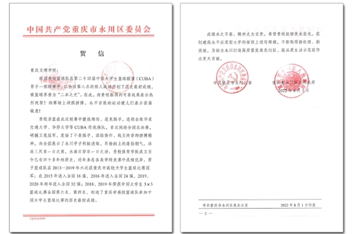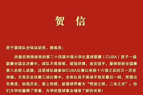 男子篮球队全体运动员、教练员: 欣悉在刚刚结束的第二十四届中国大学生篮球联赛(CUBA)男子一级联赛全国总决赛中,球队不畏艰难、顽强拼搏,连克强手,最终斩获全国赛第八名骄人成绩,这是球队继参加CUBA比赛以来获十六强之后的又一历史突破。尤其在总决赛三场比赛中,全体队员不畏强手战至最后一刻,凭借出色表现,创造历史,登上热搜,被篮球界誉为“奇迹之师,二本之光”。你们为学校赢得了荣誉,为学校篮球事业增添了新的光彩! 谨此,学校党委、行政代表两万余名师生员工向球队所取得的优异成绩表示热烈祝贺!向参加比赛的全体篮球队员、教练员和工作人员表示崇高的敬意!希望男子篮球队从新的起点出发,继续发扬优良传统,戒骄戒躁,再接再厉,再创辉煌! 十年磨一剑,一朝试锋芒。从黄瓜山下到全国赛场,篮球队传承学校前辈们的严谨、奉献精神,教练员和运动员们以坚定的意志、顽强拼搏、团队协作,取得了运动成绩和精神文明的双丰收。球队在2013至2021九年时间里共获得八次重庆市高校大学生篮球比赛冠军,两次进入全国32强,一次全国24强,一次全国16强,一次全国8强,充分展现了积极进取、昂扬向上的蓬勃朝气和文理人团结奋斗、敢于亮剑、勇于挑战、超越自我的精神风貌,极大激发了全校师生的热情和信心。 山高人为峰,海阔心为界。希望全校师生要学习男子篮球队的好作风、好精神,以男篮创造的历史为契机,振奋精神,凝聚力量,为早日建成区域性、国际化、高水平应用型大学不懈奋斗! 中共KY开元集团官网委员会 KY开元集团官网 2022年8月2日