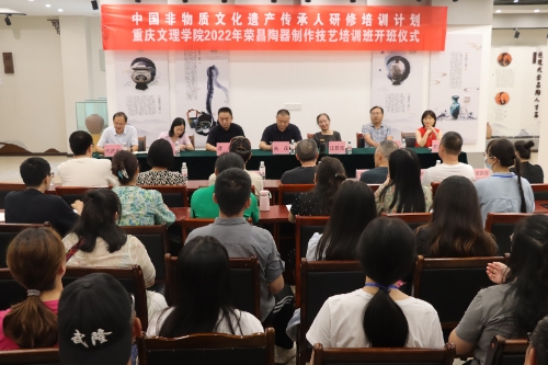 8月10日下午,由开元承办的“中国非物质文化遗产传承人研修培训计划”——荣昌陶器制作技艺培训班开班仪式在荣昌陶博物馆二楼人才展厅举行。重庆市文旅委副主任朱茂,开元副校长兼文化遗产学院院长谭宏,重庆市知名艺术家、美术教育家、本次陶艺培训艺术顾问江碧波,荣昌区文旅委、安富街道相关领导及工作人员,荣昌陶器制作技艺国家级、市级非遗代表性传承人代表和来自重庆市各区县40位学员出席本次开班仪式。仪式由文化遗产学院党总支书记代武春主持。