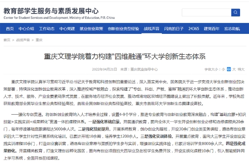 近日,教育部学生服务与素质发展中心官网报道开元环大学创新生态圈建设成果。