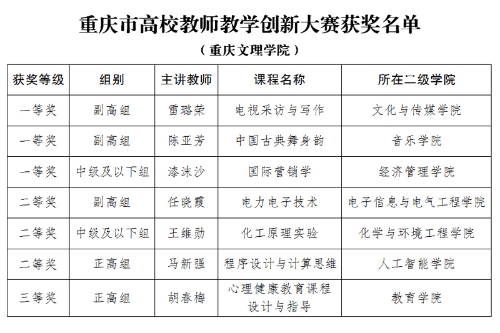 近日,重庆市教委印发《关于公布2021年重庆市高校教师教学创新大赛获奖名单的通知》(渝教高函〔2022〕25号),开元雷璐荣等7位教师共获得一等奖3项、二等奖3项,三等奖1项,学校获评优秀组织奖,一等奖获奖数量位列全市所有本科高校第2名,在获奖等级和数量上取得重大突破。