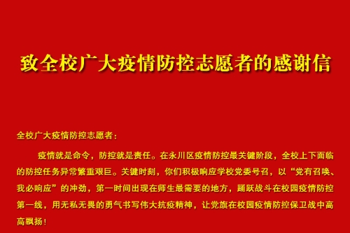 全校广大疫情防控志愿者: 疫情就是命令,防控就是责任。在永川区疫情防控最关键阶段,全校上下面临的防控任务异常繁重艰巨。关键时刻,你们积极响应学校党委号召,以“党有召唤、我必响应”的冲劲,第一时间出现在师生最需要的地方,踊跃战斗在校园疫情防控第一线,用无私无畏的勇气书写伟大抗疫精神,让党旗在校园疫情防控保卫战中高高飘扬! 病毒无情,人间有爱。你们当中有党员、干部、群众,有大学生、教职工、教职工家属等等。面对疫情,你们有的参加隔离消毒,有的参加卡点值守,有的参加全面精准摸排,有的服务全员核酸检测……出现在所有可能需要的地方。你们一言一行温暖人心、抚慰人心、鼓舞人心、激励人心,更是用行动树起标杆,用坚守诠释担当,用奉献铸就情怀,用真情传递大爱,让抗疫逆行“红马甲”,成为文理校园里最美风景线。 在此,向你们表示最真诚的感谢和最崇高的敬意!感谢你们为校园疫情防控工作给予的大力支持和无私奉献!大疫面前有大爱,让我们携起手来,以扎实的作风、担当的精神和攻坚的勇气,坚决打赢疫情防控校园保卫战! 中共KY开元集团官网委员会 2022年3月30日