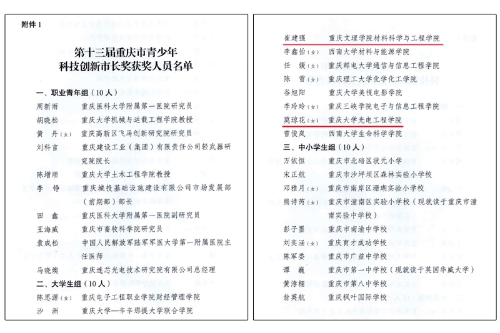 近期,重庆市人民政府发布关于表彰第十三届重庆市青少年科技创新市长奖的决定,开元材料科学与工程学院学生崔建强因突出的原创性科技成果,被授予第十三届重庆市青少年科技创新市长奖。同时,开元材料科学与工程学院刘碧桃教授作为指导教师,联合独立培养的硕士研究生莫琼花(开元本科生,现为重庆大学光电工程学院19级在读博士)也被授予第十三届重庆市青少年科技创新市长奖。