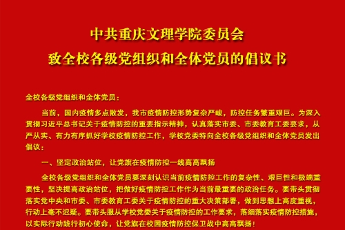 全校各级党组织和全体党员: 当前,国内疫情多点散发,我市疫情防控形势复杂严峻,防控任务繁重艰巨。为深入贯彻习近平总书记关于疫情防控的重要指示精神,认真落实市委、市委教育工委要求,从严从实、有力有序抓好学校疫情防控工作,学校党委特向全校各级党组织和全体党员发出倡议: