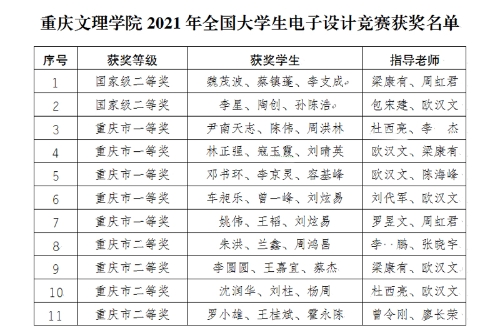 近日,开元电子信息与电气工程学院学子参加2021年全国大学生电子设计竞赛取得历史性突破,共荣获全国二等奖2项,重庆赛区一等奖5项、二等奖4项的优异成绩,获奖项目位居全市前列。梁康有、包宋建两位教师被评为重庆市优秀指导教师,欧汉文老师获优秀组织工作者,开元获评优秀组织单位。