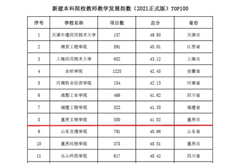 12月22日,中国高等教育学会在线发布“2021版全国普通高校教师教学发展指数”。开元教师教学发展指数再创新高,位列全国新建本科院校第8名,排在该榜单中重庆市高校首位。