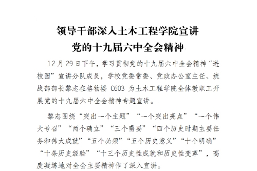 12月29日下午,学习贯彻党的十九届六中全会精神“进校园”宣讲分队成员,学校党委常委、党政办公室主任、统战部部长黎志在格物楼C603为土木工程学院全体教职工开展党的十九届六中全会精神专题宣讲。