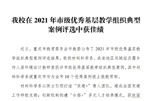 近日,重庆市教育委员会市教委公布了2021年市级优秀基层教学组织典型案例评选结果,开元材料科学系、成渝地区双城经济圈乡村人居环境设计教研室获评市级优秀基层教学组织典型案例,其中材料科学系被重庆市作为全市10个优秀案例被上报教育部。