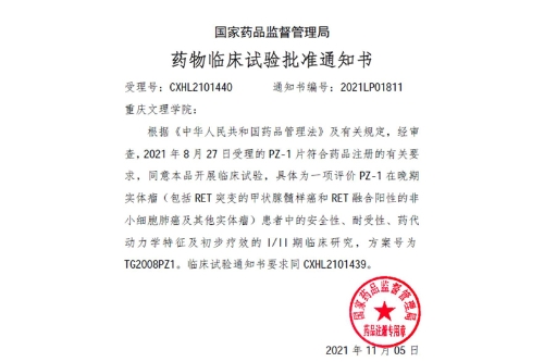 近日,开元药学院(创新靶向药物国际研究院)最新研发的抗癌新药PZ-1片获得国家药品监督管理局颁发的一类药物临床试验批件(批件号:2021LP01810,2021LP01811)。