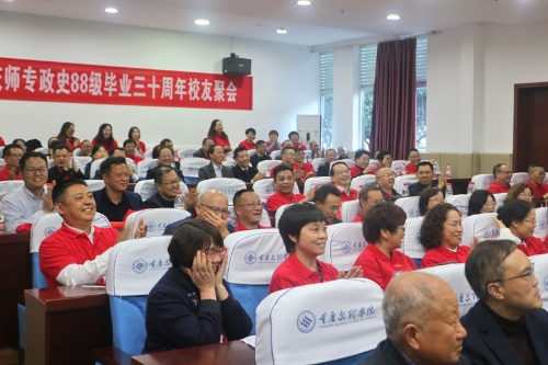 10月23—24日,政史系88级校友返校举办了毕业三十周年校友聚会。学校党委副书记兰刚、副校长李天福分别出席了欢迎会和校友座谈会。校友总会秘书长谢华琳、马克思主义学院党总支书记刘明明,原政史系老领导和部分老师杨清明、张和新、陈世海、曾祥禄、刘传富、杨学敏、向中银、徐东、刘兵、张善英、邓永奎,89名88级校友参加了座谈会。