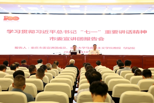 9月10日,按照重庆市党史学习教育领导小组的部署和中共重庆市委教育工作委员会党史学习教育领导小组的安排,学习贯彻习近平总书记“七一”重要讲话精神市委宣讲团报告会在开元举行。市委宣讲团成员、重庆大学马克思主义学院鄢显俊教授作宣讲报告,全体在家校领导、中层干部、思政课教师和辅导员聆听了报告。宣讲会分为两场,分别由学校党委副书记兰刚和党委宣传部副部长杨正强主持。