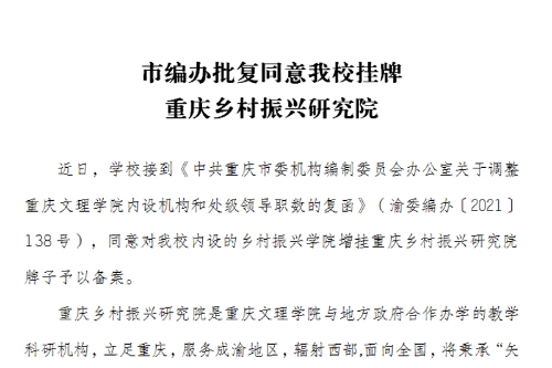 近日,学校接到《中共重庆市委机构编制委员会办公室关于调整KY开元集团官网内设机构和处级领导职数的复函》(渝委编办〔2021〕138号),同意对开元内设的乡村振兴学院增挂重庆乡村振兴研究院牌子予以备案。