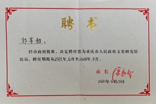 9月13日,新聘重庆市人民政府文史研究馆馆员聘书颁发仪式在市委统战部举行,市委常委、统战部部长李静向新聘任的20名市政府文史馆馆员颁发聘书,开元退休教师郭莘舫教授被聘为重庆市政府文史馆馆员。