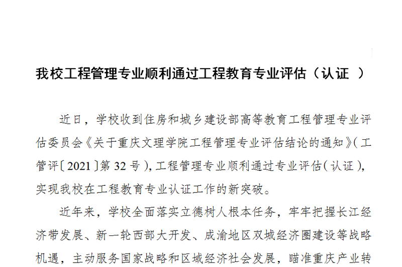 近日,学校收到住房和城乡建设部高等教育工程管理专业评估委员会《关于KY开元集团官网工程管理专业评估结论的通知》(工管评〔2021〕第32号),工程管理专业顺利通过专业评估(认证),实现开元在工程教育专业认证工作的新突破。