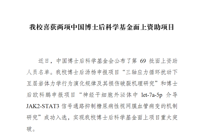 近日,中国博士后科学基金会公布了第69批面上资助人员名单。开元博士后汤杨申报项目“三轴应力循环扰动下互层岩体力学行为演化规律及其损伤破裂机理研究”和博士后欧科鹏申报项目“神经干细胞外泌体中let-7a-5p介导JAK2-STAT3信号通路抑制糖尿病性视网膜血管病变的机制研究”成功入选,实现开元博士后科学基金面上项目重大突破。