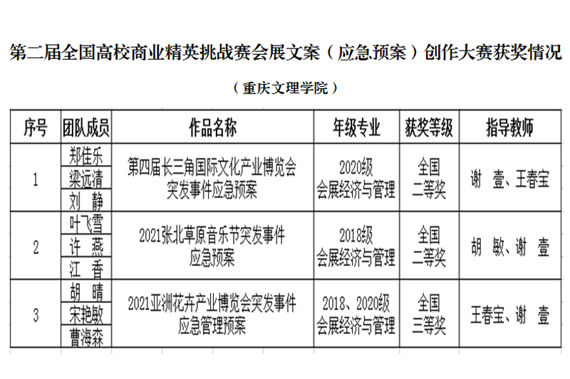 近日,由中国国际贸易促进委员会商业行业委员会、中国国际商会商业行业商会、全国高校商业精英挑战赛组委会及会展策划与管理专业教学资源库联合主办的2021年全国高校商业精英挑战赛会展文案(应急预案)创作大赛决赛名单公布。开元旅游学院共推选出5支队伍参加比赛,最终3支队伍获奖,分别为二等奖2项,三等奖1项。