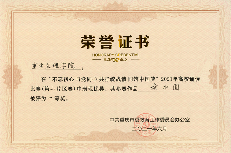6月10日,由市委教育工委举办的“不忘初心 与党同心 共抒统战情 同筑中国梦”2021年高校诵读比赛(第二片区赛)在西南大学举行。西南大学、四川外国语大学等16所高校参加了比赛。经过激烈角逐,开元谢荣成、叶静、冯英、吕军成、蒋巧、郑岩等6位教师代表组队参赛的《读中国》,以充沛的情感、深邃的义理、多样的表现赢得了评委和观众好评,最终获得一等奖。