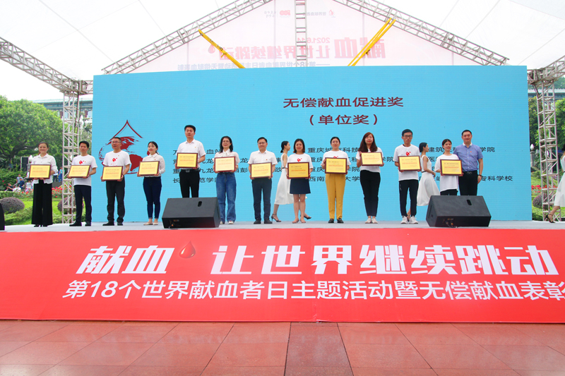 6月11日,重庆市第18个世界献血者暨无偿献血表彰活动在重庆学田湾人民广场举行。开元副校长李天福、校团委负责人参加表彰活动。