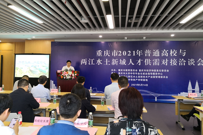 5月14日下午,重庆市2021年普通高校与重庆两江新区水土高新技术产业园人才供需对接洽谈会在重庆两江半导体研究院举行。市教委二级巡视员谯建,两江投资集团副总裁、两江水土投资公司董事长杨云峰,市教委、市经信委相关处室负责人,两江水土投资公司相关负责人,西南大学、重庆医科大学等15所高校代表,重庆京东方显示技术有限公司、重庆莱宝科技有限公司等14家高新园区企业相关负责人参与会议。学校副校长李天福率招生就业处负责人参会。
