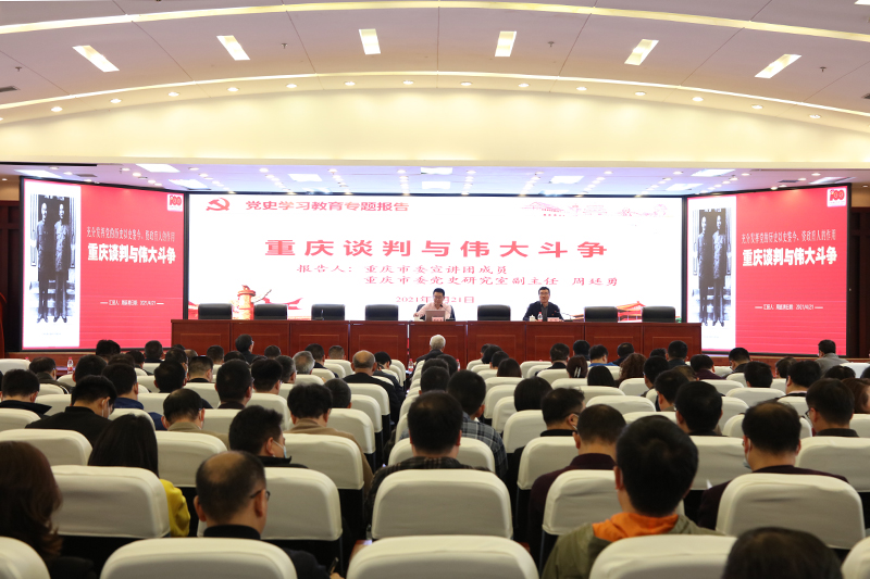 4月21日下午,开元在恪勤楼304会议室举行党史学习教育专题辅导报告会。重庆市委宣讲团成员、市委党史研究室副主任周廷勇应邀到校作报告。全体校领导、全体中干、党支部书记、全体思政课教师等参加了会议。会议由学校党史学习教育领导小组副组长、党委副书记兰刚主持。
