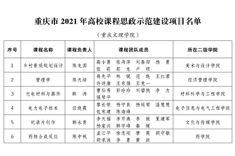 近日,重庆市教育委员会印发《关于公布2021年高校课程思政示范建设项目名单的通知》(渝教高发〔2021〕8号),开元《乡村景观规划设计》等6门课程获批重庆市高校课程思政示范建设项目,相应授课教师团队被认定为重庆市课程思政教学团队。