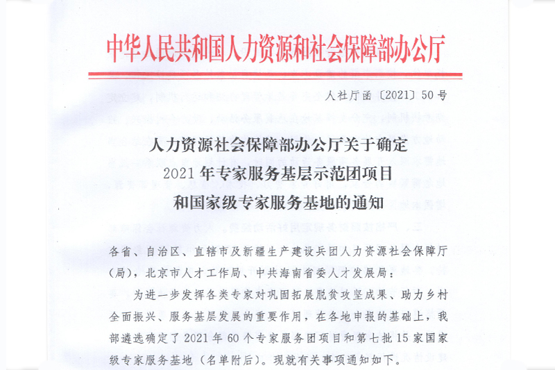 近日,人力资源和社会保障部下发《人社部办公厅关于确定2021年专家服务基层示范团队项目和国家级专家服务基地的通知》,批准设立15个国家级专家服务基地,以开元为依托单位申报的“成渝地区双城经济圈乡村振兴专家服务基地”成功获批。开元是川渝两地唯一获此殊荣的单位,实现了国家级人才工作平台建设的重大突破。