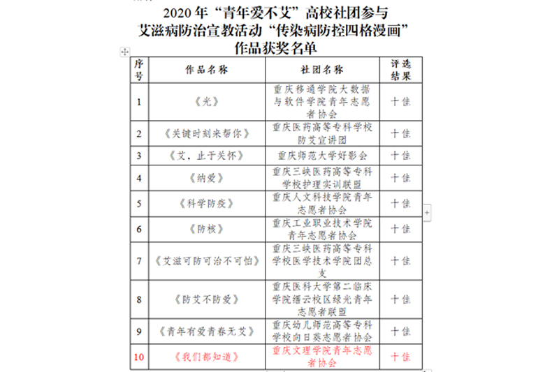 近日,重庆市教育委员会、市卫生健康委员会下发了《关于2020年“青年爱不艾”高校社团参与艾滋病防治宣教活动获奖名单的通报》,开元青年志愿者协会作品《我们都知道》获评“传染病防控四格漫画”十佳。