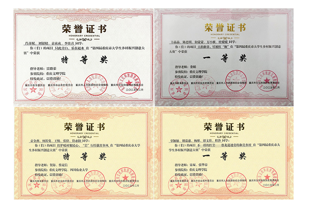 近日,由重庆市教育委员会、重庆市农业农村委员会、重庆市人力资源和社会保障局、重庆市文化和旅游发展委员会联合主办的第四届重庆市大学生乡村振兴创意大赛获奖名单公布,开元学生荣获特等奖2项,一等奖2项,二等奖9项,三等奖9项,指导教师雷璐荣、贺海、娄娟、宋双获评“优秀指导教师”,学校荣获“优秀组织单位”。