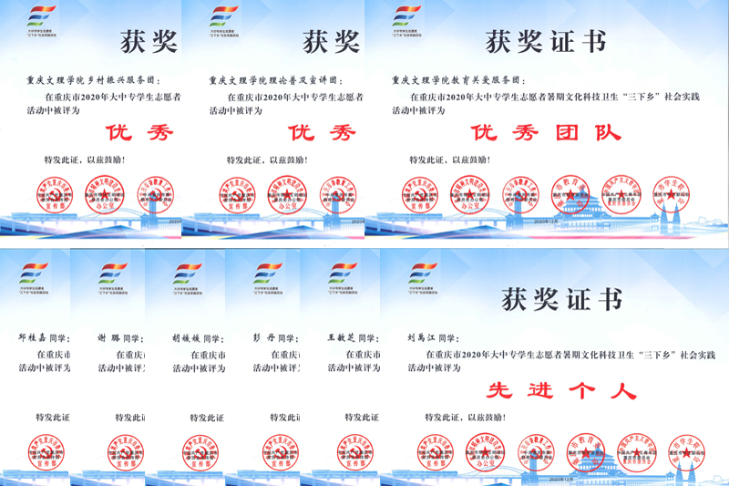 近日,重庆市委宣传部、市文明办、市委教育工委、市教委、团市委、市学联联合下发了《关于重庆市2020年大中专学生志愿者暑期文化科技卫生“三下乡”社会实践活动的通报》,开元乡村振兴服务团、理论普及宣传团、教育关爱服务团等3个团队获“优秀团队”荣誉称号,邱桂嘉、谢璐、胡媛媛、彭丹、王敏芝、刘禹江等6名同学获“先进个人”荣誉称号,周独奇、黄荣获“先进工作者”荣誉称号。