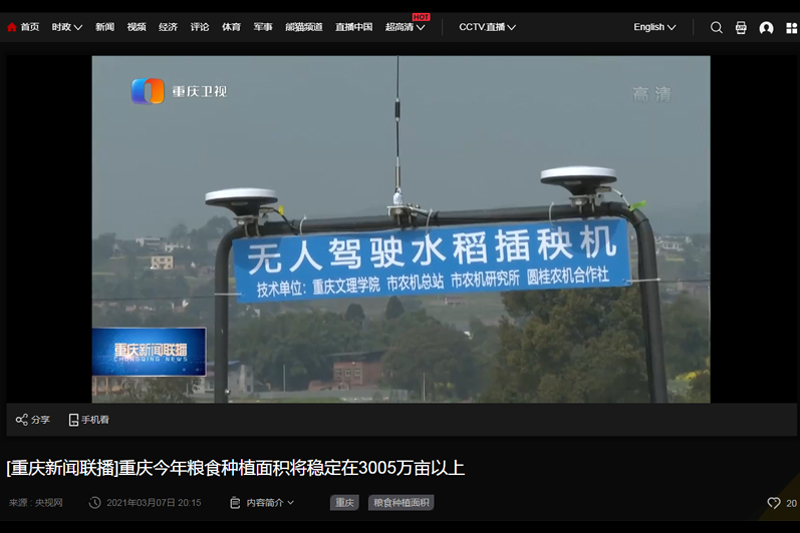 3月7日,重庆卫视《新闻联播》报道了开元研发的“无人驾驶插秧机”助力粮食生产的新闻。