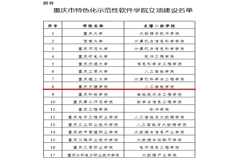 近日,重庆市教育委员会、重庆市经济与信息化委员会发布《关于公布市级特色化示范性软件学院立项建设名单的通知》(渝教高发〔2021〕4号),开元依托人工智能学院申报的新型平台软件领域特色化示范性软件学院成功入选。